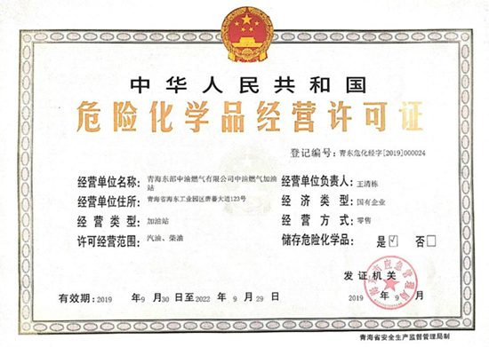 為使各項(xiàng)目達(dá)到合規(guī)化運(yùn)營條件,青海東部中油燃?xì)庥邢薰居谀陜?nèi)進(jìn)一步加大了與海東市政府、河湟新區(qū)管委會(huì)及平安區(qū)政府的工作協(xié)調(diào)力度,取得了較好的溝通效果,經(jīng)過近兩個(gè)月的積極溝通和努力,終于在近期取得了平西加油站《危險(xiǎn)化學(xué)品經(jīng)營許可證》。