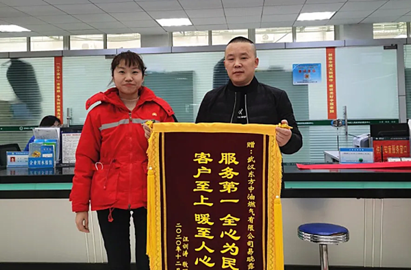近日,家住武漢市蔡甸區(qū)唐河村西山林語9-1-602業(yè)主汪先生專程來到蔡甸區(qū)行政服務(wù)大廳將“服務(wù)第一 全心為民 客戶至上 暖至人心”的錦旗送到武漢東方中油燃?xì)庥邢薰抉v蔡甸區(qū)行政審批局窗口,并對燃?xì)獯翱诜?wù)人員易曉露主動(dòng)暖心的服務(wù)給予了高度評價(jià)。