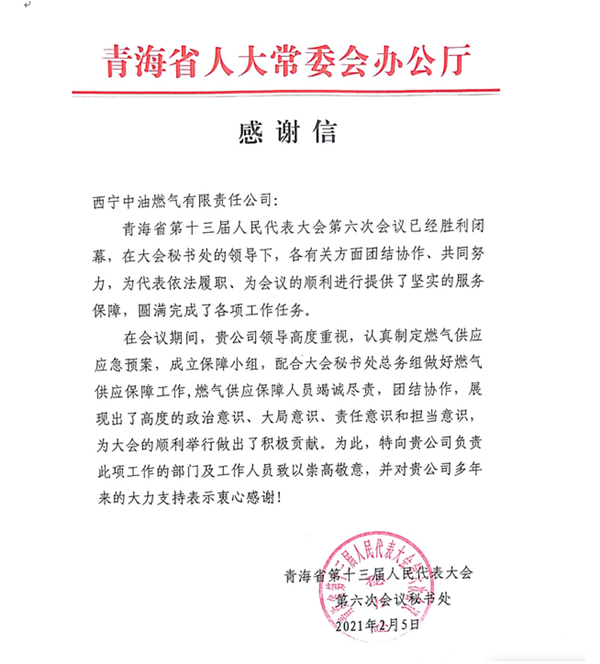 2月5日,省人大常委會辦公廳向西寧中油燃氣發(fā)來感謝信,對西寧中油燃氣在省十三屆六次會議期間,高度重視,周密部署,盡職盡職,以高度的政治意識、大局意識、責(zé)任意識和擔(dān)當意識做好燃氣供應(yīng)保障工作,為大會的順利舉行做出積極貢獻表示感謝。