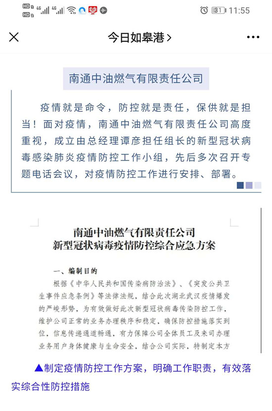 《今日如皋港》:南通中油燃氣有限責任公司新型冠狀病毒疫情防控綜合應急方案