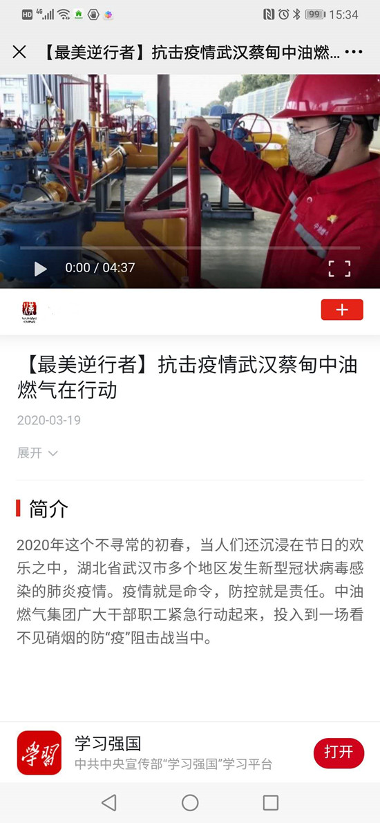 《學(xué)習(xí)強(qiáng)國》:抗擊疫情,武漢蔡甸中油燃?xì)庠谛袆?dòng)