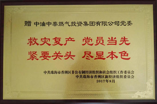 為表彰集團公司黨委在“天鴿”風災中救災復產(chǎn)的突出表現(xiàn),9月14日,珠海市香洲區(qū)兩新組織黨委副書記梁何一行來到集團總部,向集團黨委頒發(fā)了“救災復產(chǎn),黨員當先,緊要關頭,盡顯本色”的榮譽牌匾,并授予集團黨委“黨員自愿者服務大隊”旗幟。