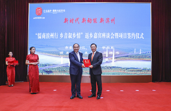 9月30日下午,山東省“儒商大會(huì)2018”閉幕后,濱州市舉行主題為“新時(shí)代 新動(dòng)能 新濱州”的“儒商濱州行,鄉(xiāng)音敘鄉(xiāng)情”返鄉(xiāng)嘉賓座談會(huì)暨簽約儀式。