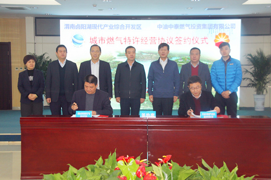 2019年1月3日,集團(tuán)公司在陜西渭南市鹵陽湖經(jīng)濟(jì)開發(fā)區(qū)簽訂《渭南鹵陽湖經(jīng)濟(jì)開發(fā)管道燃?xì)馓卦S經(jīng)營(yíng)權(quán)協(xié)議》。集團(tuán)公司總裁劉連勇、鹵陽湖管委會(huì)主任趙曉軍出席了簽約儀式。