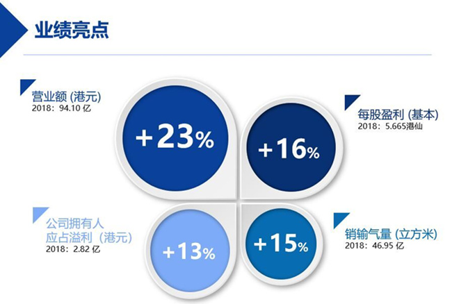 集團(tuán)總營(yíng)業(yè)額增長(zhǎng)23%至94.10億港元(2017年:76.51億港元),毛利潤(rùn)增長(zhǎng)12%至13.65億港元(2017年:12.16億港元),銷輸氣量增長(zhǎng)15%至46.95億立方米(2017年:40.76億立方米),公司擁有人應(yīng)占溢利增長(zhǎng)13%至2.82億港元(2017年:2.50億港元)。